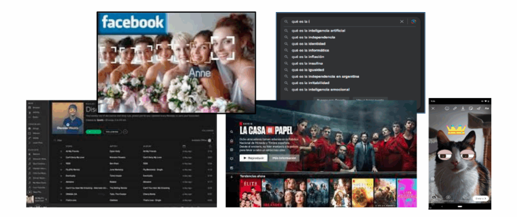 Tenemos la red social Facebook, el buscador de Google, Spotify, Netflix y un filtro de imágenes. Por un lado, todas son aplicaciones que usamos en nuestros celulares o computadoras. Pero hay otra característica que tienen en común. Y es que en todas estas aplicaciones cuentan con funcionalidades que han sido desarrolladas con técnicas que forman parte de la inteligencia artificial: como, por ejemplo, en el caso de Facebook, una de las funcionalidades más utilizadas y conocidas es el etiquetado automático de personas y objetos; también la herramienta que sugiere búsquedas en Google que intenta autocompletar nuestro texto con diferentes opciones; o Spotify y Netflix, cuando nos recomiendan nuevas canciones, series o películas, utilizan sistemas de recomendación desarrolladas con IA.